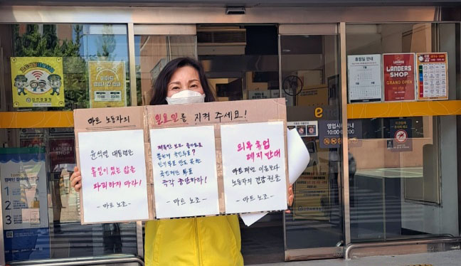 이어 “회사는 일자리를 제공하고, 노동자는 노동력을 제공하는 동등한 관계이기 때문에 회사가 더 성장하기 위해서는 노동자와 상의 및 합의하는 것은 당연하다.”면서, “본사 지침 운운하며 마트 노동자의 휴식시간까지 빼앗으려는 건 부당하다.”고 목소리를 높였다.